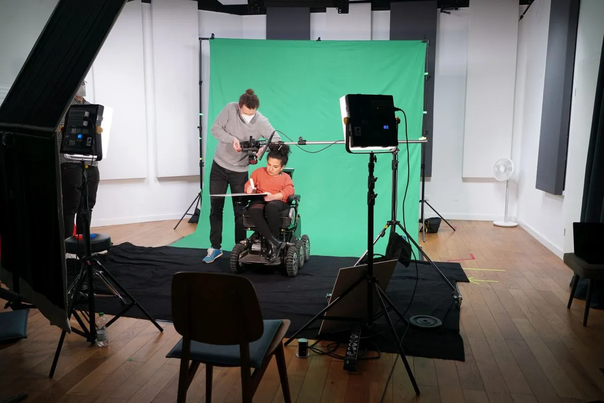 Um die Protagonisten frei vor den später gewählten Hintergrund setzen zu können, kam hier der Greenscreen zum Einsatz – für maximale Flexibilität in der Postproduktion! Visuell und inhaltlich findet das Storytelling vor allem durch die drei „Inkluencer“ (Leeroy Matata, Cindy Klink & Kübra Sekin) vor der Kamera statt, die ihre Forderungen für eine inklusive Gesellschaft auf Basis ihrer eigenen, ganz persönlichen Erfahrungen formulieren.